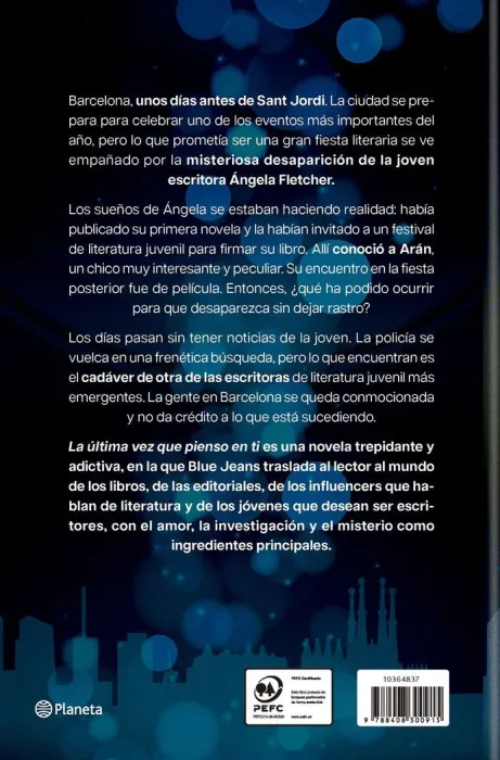 La última vez que pienso en ti es una novela trepidante y adictiva, en la que Blue Jeans traslada al lector al mundo de los libros, de las editoriales, de los influencers que hablan de literatura y de los jóvenes que desean ser escritores, con el amor, la investigación y el misterio como ingredientes principales.